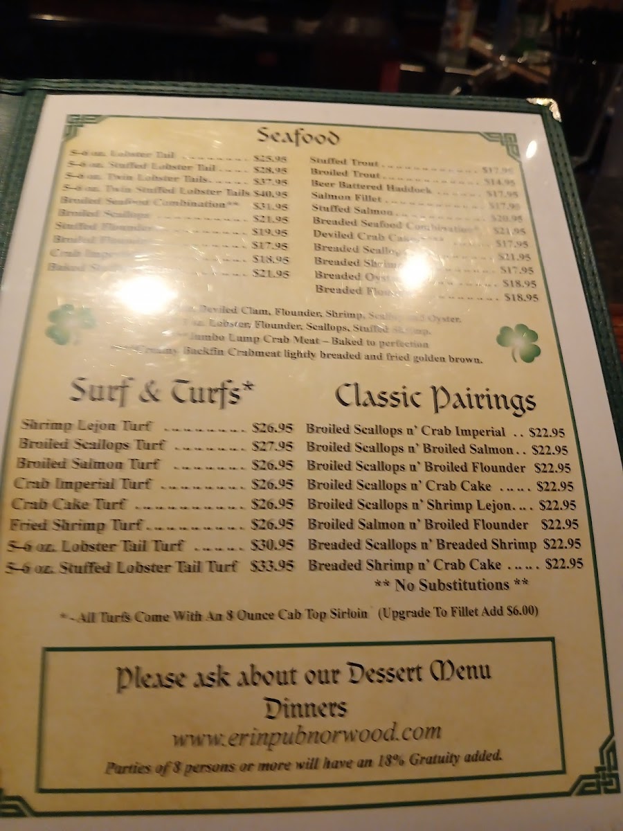 Located in the heart of Norwood, PA, Erin Pub offers a delightful taste of Ireland with a rich menu that caters to all cravings. From hearty appetizers like Shrimp Lejon and Deviled Clams to mouthwatering mains such as the tender Prime Rib and Filet Mignon, every dish is crafted with quality ingredients and flavor in mind. Seafood lovers will revel in the 7 oz. Lobster Tail Special, while the classic Chicken Marsala and Chicken Parmigiana appeal to those seeking comfort food.